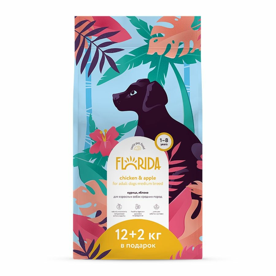 Florida Chicken and Apple - сухой корм супер-премиум-класса с курицей и яблоком взрослых собак средних пород. Сбалансированное полнорационное питание, способствующее правильному функционированию всего организма и нормализации пищевых процессов. В рационе кормов Florida используется только белок животного происхождения.