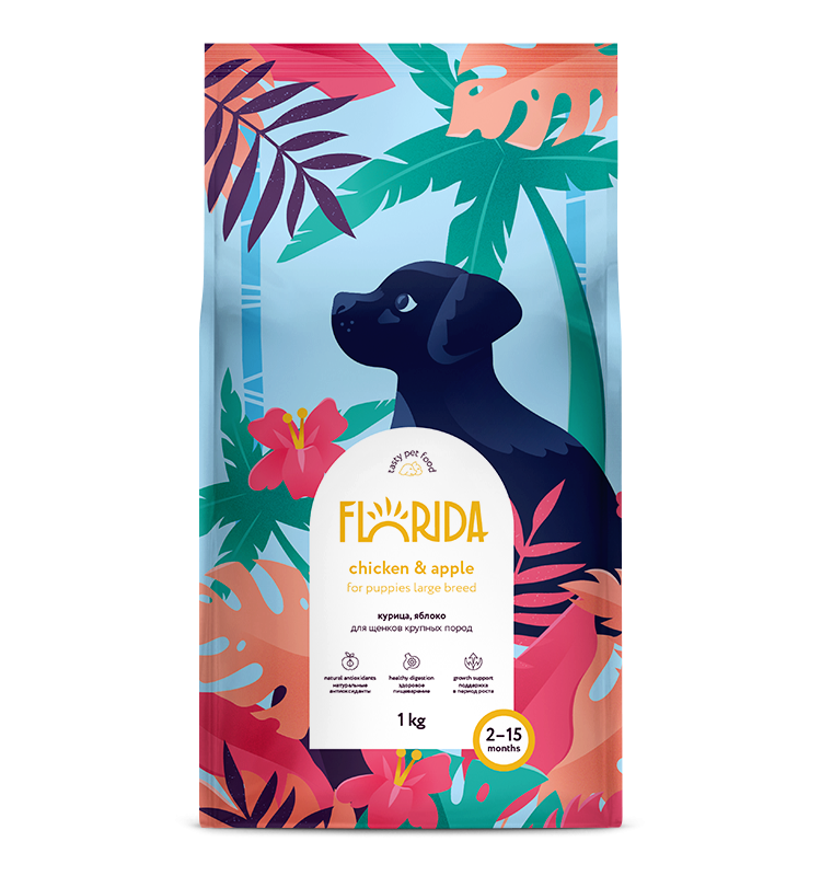 Florida Chicken and Apple - сухой корм супер-премиум-класса с курицей и яблоком для щенков крупных пород. Сбалансированное полнорационное питание, способствующее правильному развитию щенка. В рационе кормов Florida используется только белок животного происхождения.