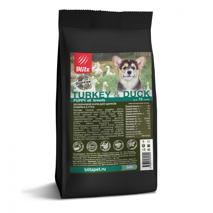 Blitz Adult сухой беззерновой корм для щенков с индейкой и уткой - 500 г