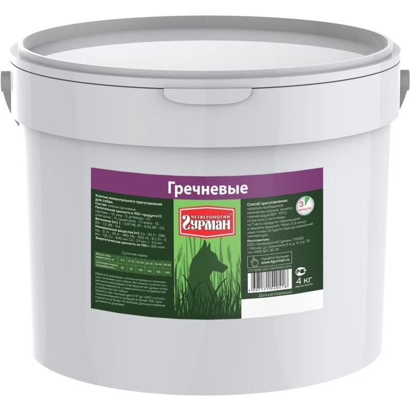 Рекомендуется использовать в сочетании с мясными консервами "Четвероногий гурман". Ингредиенты: хлопья гречневые. Пищевая ценность (в 100 г продукта): Минеральные вещества (в 100 г продукта): Витамины (в 100 г продукта): Энергетическая ценность (на 100 г): 305 ккал.