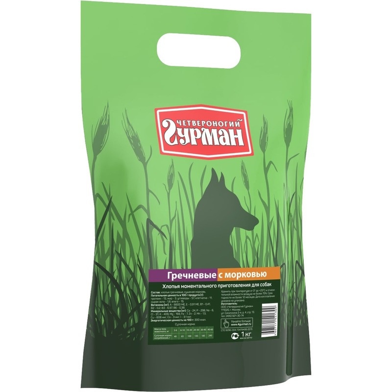 Рекомендуется использовать в сочетании с мясными консервами "Четвероногий гурман". Ингредиенты: хлопья гречневые, сушеная морковь. Пищевая ценность (в 100 г продукта): Минеральные вещества (в 100 г продукта): Витамины (в 100 г продукта): Энергетическая ценность (на 100 г): 300 ккал.