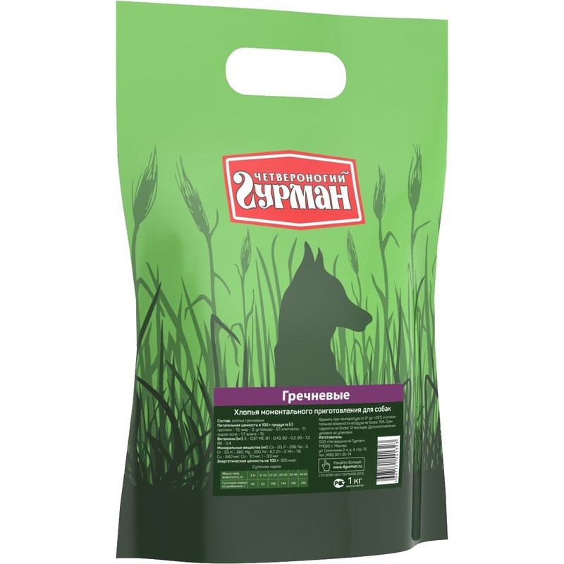 Рекомендуется использовать в сочетании с мясными консервами "Четвероногий гурман". Ингредиенты: хлопья гречневые. Пищевая ценность (в 100 г продукта): Минеральные вещества (в 100 г продукта): Витамины (в 100 г продукта): Энергетическая ценность (на 100 г): 305 ккал.