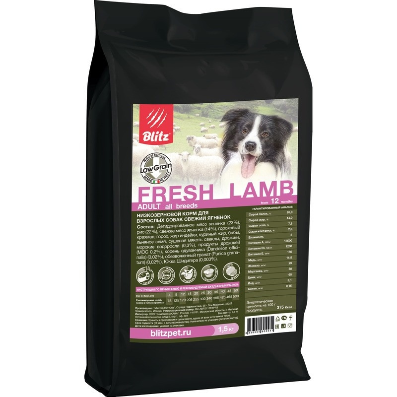 Сухой низкозерновой корм Blitz Adult для взрослых собак с ягненком - 1,5 кг