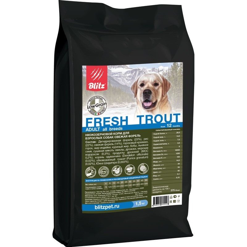 Сухой низкозерновой корм Blitz Adult для взрослых собак с форелью - 1,5 кг
