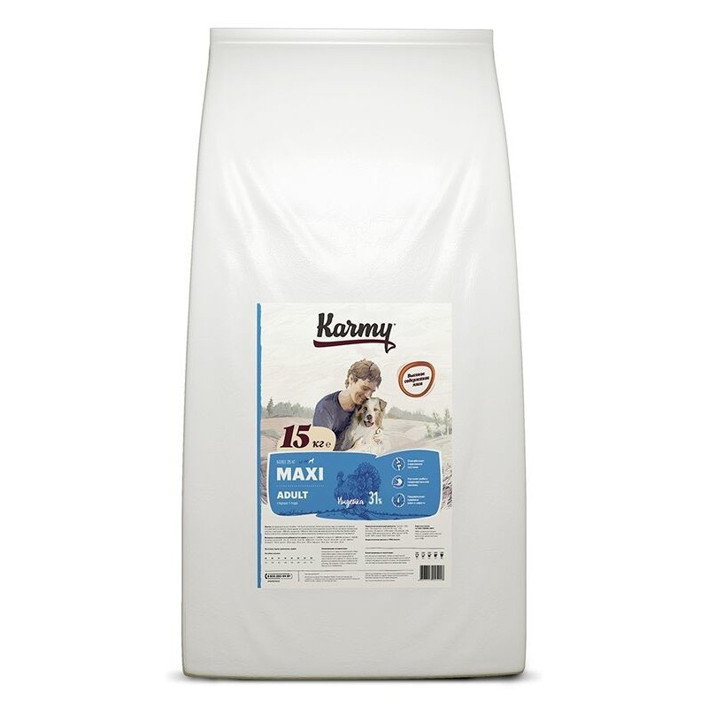 Karmy Maxi Adult – сухой корм для взрослых собак крупных пород старше 1 года. Преимущества: Ингредиенты: Показатели питательной ценности: Энергетическая ценность: 3750 ккал/кг.