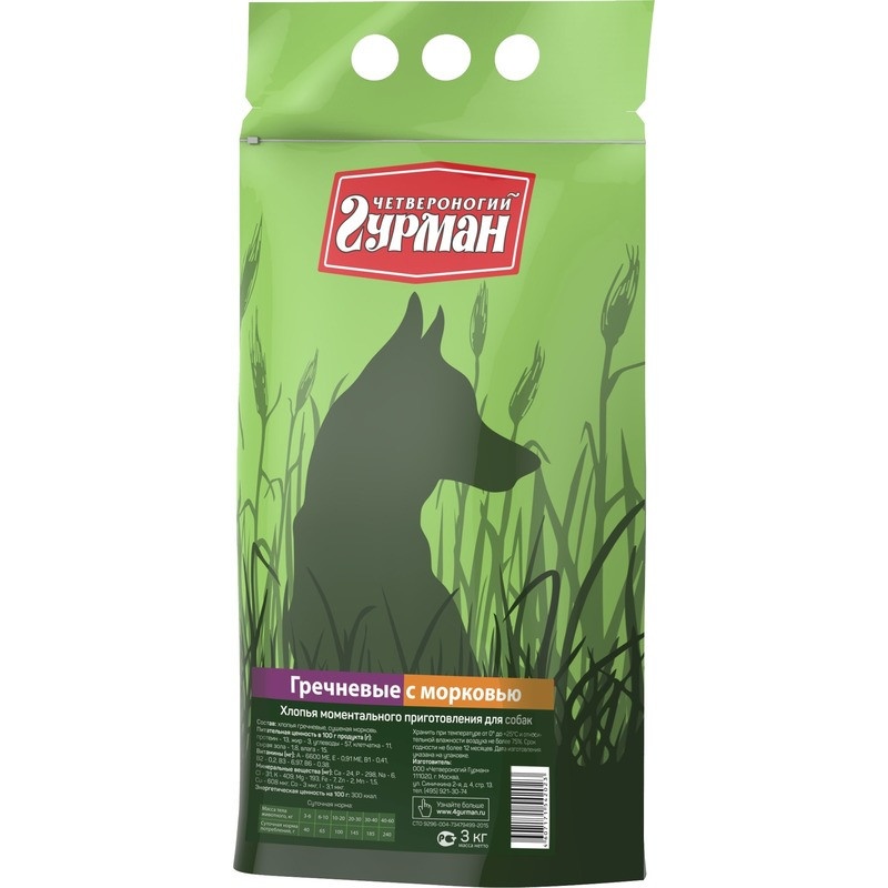 Рекомендуется использовать в сочетании с мясными консервами "Четвероногий гурман". Ингредиенты: хлопья гречневые, сушеная морковь. Пищевая ценность (в 100 г продукта): Минеральные вещества (в 100 г продукта): Витамины (в 100 г продукта): Энергетическая ценность (на 100 г): 300 ккал.