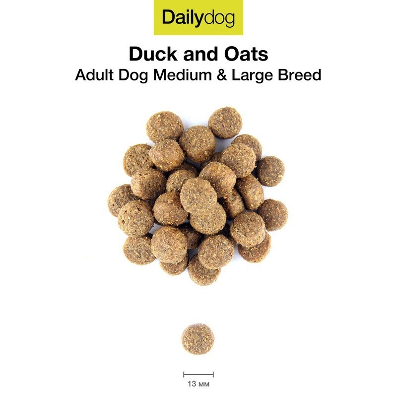 Dailydog Adult Medium & Large Breed Duck and Oats – корм супер премиум класса для собак крупных и средних пород. Рекомендован для собак крупных и средних пород с 1 года до 7 лет жизни. Все вкусы порядком надоели?! Побалуйте свою любимую собаку наивкуснейшим меню Dailydog Adult Medium & Large Breed Duck and Oats. Утка это дичь, собака это охотник, поймав утку за хвост, Ваш питомец получит деликатесный, диетический обед, взрыв вкуса и максимум здоровья. Dailydog – это гарантия отличного самочувствия и превосходного настроения для каждого хвостатого питомца. дегидратированное мясо (утка 23%), овес 23%, очищенный овес, животный жир, картофельный протеин, сушеный жом свеклы 2%, сушеный корень цикория 1%, фруктоолигосахариды (ФОС) 1%, сухие дрожжи, рыбий жир 0.5%, калия хлорид, натрия хлорид, дикальция фосфат, юкка Шидигера, глюкозамин (400 мг/кг), биологический комплекс растительных экстрактов 0.03% (гвоздика, цитрусовые, виноградная лоза, розмарин, куркума), хондроитина сульфат (100 мг/кг). Анализ компонентов: сырой протеин 23.5%, сырые масла и жиры 12.0%, сырая клетчатка 3.5%, сырая зола 6.9%, кальций 1.0%, фосфор 0.8%, магний 0.2%, натрий 0.42%, калий 0.60%, влажность: 10.0%. Энергетическая ценность: 3.400 ккал/кг. Пищевые добавки: витамин A 22,000 МЕ/кг, витамин D3 1,800 МЕ/кг, витамин E (альфа-токоферола ацетат) 280 мг/кг, Витамин B1 (тиамина мононитрат) 1.3 мг/кг, витамин B2 (рибофлавин) 6 мг/кг, витамин B6 1.3 мг/кг, витамин B12 0.03 мг/кг, никотиновая кислота 14 мг/кг, фолиевая кислота 0.24 мг/кг, пантотеновая кислота (кальций D- пантотенат) 13 мг/кг, биотин 0.28 мг/кг, витамин C (аскорбил монофосфат натриевой соли) 70 мг/кг, сульфат железа моногидрат 365 мг/кг (железо 110 мг/кг), хелат железа аминокислот гидрат 200 мг/кг (железо 32 мг/кг), сульфат меди пентагидрат 48 мг/кг (медь 12 мг/кг), сульфат марганца моногидрат 83 мг/кг (марганец 26 мг/кг), хелат марганца аминокислот гидрат 200 мг/кг (марганец 32 мг/кг), сульфат цинка моногидрат 500 мг/кг (цинк 175 мг/кг), хелат цинка аминокислот гидрат 200 мг/кг (цинк 36 мг/кг), йодат кальция безводный 6.4 мг/кг (йод 4 мг/кг), селенит натрия 0.75 мг/кг (селен 0.34 мг/кг). Антиоксиданты 0.03% (гвоздика, цитрусовые, виноградная лоза, розмарин, куркума).