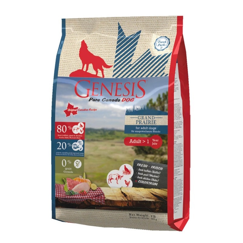 Genesis Pure Canada Grand Praire Adult для взрослых собак всех пород с чувствительным пищеварением с курицей, буйволом и перепелками 907 гр