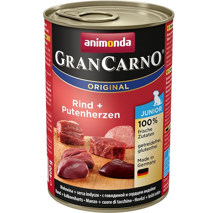 Консервы Animonda Gran Carno Original Junior с говядиной и сердцем индейки для щенков и юниоров - 400 гр х 6 шт Консервы Animonda Gran Carno Original Junior – уникальные корма супер-премиум класса для щенков. Разработаны с привлечением профессиональных диетологов с учетом особых потребностей юного питомца. Корма Анимонда Гран Карно Оригинал изготавливаются исключительно из отборного и свежего мяса. Это позволяет сохранить исключительный вкус и все полезные вещества, столь необходимые для вашего четвероного друга. Данный консервированный корм не содержит искусственных красителей, добавок, усилителей вкуса и пр химии. В этом просто нет необходимости! Консервы отличаются тем естественным вкусом мяса, который собаки любят больше всего на свете. Также не содержат зерновых культур и сои! По консистенции напоминают тушенку (но намного качественней и без жира!). Важно отметить тот факт, что корма Animonda Gran Carno Original Junior не просто лакомство, а полнорационное питание на каждый день, обеспечивающее всеми необходимыми витаминами и минералами вашего маленького питомца. Консервы Анимонда Гран Карно Оригинал Джуниор отличаются настоящим немецким качеством, безумно аппетиты, имеют отличную поедаемость и содержат только лучшие и качественные ингредиенты.