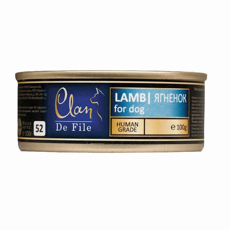 Clan De File - полнорационный влажный корм для собак. Высококачественный суперпремиальный влажный корм из мясного филе категории Human Grade (человеческий стандарт качества). Используется один вид белка в составе кормов. Срок годности - не более 3 лет со дня изготовления при соблюдении условий хранения. Дата изготовления указана на крышке банки. Состав Ягненок, желирующая добавка, соль, вода. Пищевая ценность в 100 г. продукта: сырой протеин, не менее - 10,0 г; сырой жир , не более - 14,0 г; сырая зола, не более - 2,0 г; массовая доля поваренной соли - 0,3-0,7 г; влага, не более - 82 %. Минеральные вещества в 100 г. продукта: общий фосфор, не более - 0,4 г; кальций, не более - 0,3 г; Энергетическая ценность в 100 г. продукта - 166,0 ккал