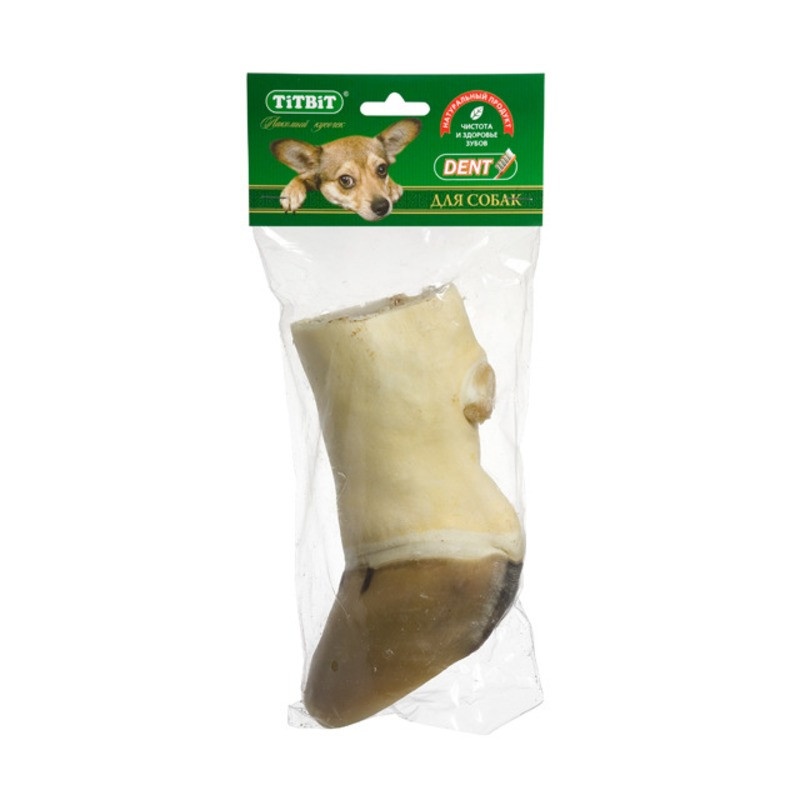 Высушенная говяжья голень с копытом, разрезанная вдоль. Изделие содержит кожу, костную ткань, жир, соединительную ткань и небольшие прослойки мышечной ткани. Обеспечивают дополнительное поступление в организм глюкозамина и хондроитина – составных элементов для роста, развития и поддержания в норме суставов собак.