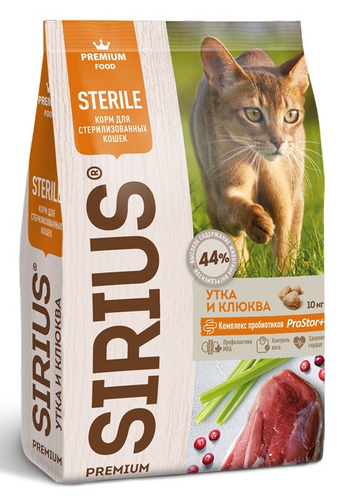 SIRIUS - сухой корм премиум класса для полноценного ежедневного рациона стерилизованных кошек. Высокое содержание мясных ингредиентов обеспечивает оптимальный уровень белка и укрепляет мышцы. Пониженное содержание жиров для контроля веса. Баланс витаминов и комплекса пробиотиков 4-го поколения PROSTOR+ нормализует пищеварение и укрепляет иммунитет. Омега 3 и Омега 6 способствуют поддержанию здоровья сердца, мозга, нервной системы, здоровья кожи и красоты шерсти. Корм способствует профилактике мочекаменной болезни.