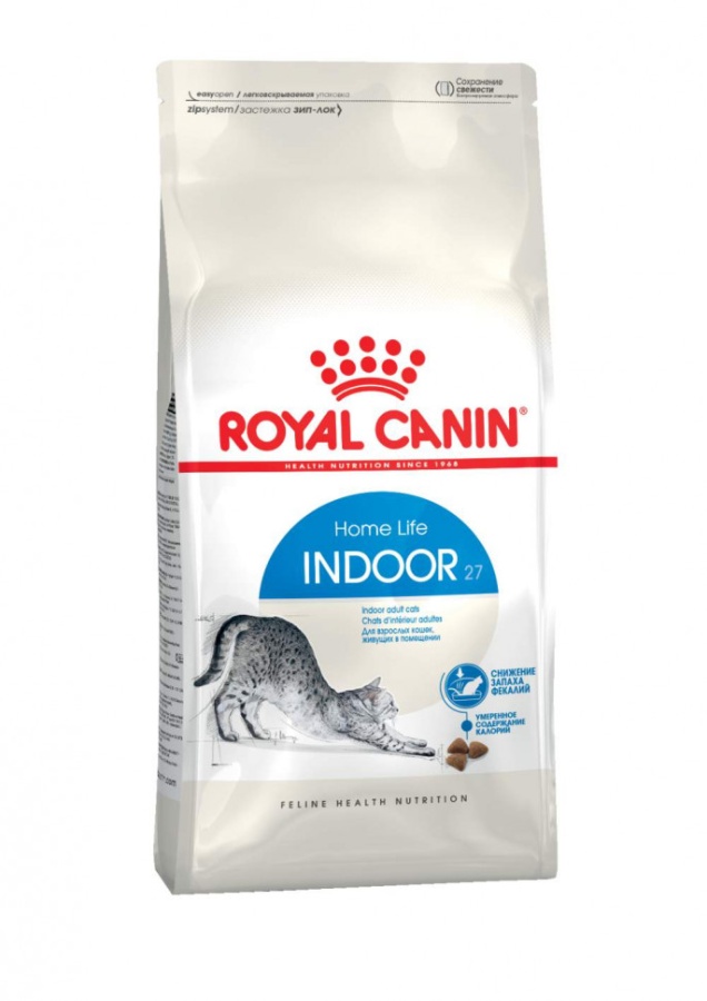 Корм для кошек от 1 до 7 лет, живущих в помещении. Высокоперевариваемый корм Royal Canin Indoor 27 способствует значительному ослаблению запаха стула кошки в результате уменьшения выделения сероводорода – зловонного газа, выделяющегося из фекалий. Умеренное содержание энергии: способствует уменьшению жировых отложений у кошек за счет умеренного содержания калорий и добавления L-карнитина (50 мг/кг). Выведение волосяных комочков: стимулирует кишечный транзит благодаря сочетанию ферментируемой и неферментируемой клетчатки.