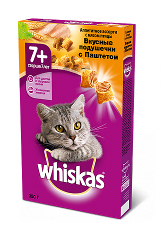 Whiskas сухой корм в форме подушечек с паштетом, аппетитное ассорти с мясом птицы для пожилых кошек старше 7 лет - 350 гр