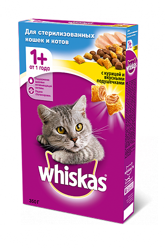Создан специально, учитывая особые потребности Вашей любимицы. Хрустящие подушечки с нежным паштетом внутри обязательно придутся по вкусу Вашей кошке. Кроме того, корм Whiskas® содержит все необходимое, чтобы еда Вашей стерилизованной любимицы была не только вкусной, но и полезной.