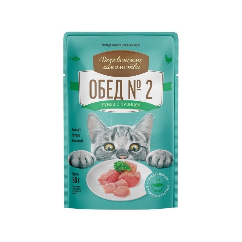 Деревенские лакомства влажный корм для кошек, обед №2 тунец с курицей в нежном желе - 50 г