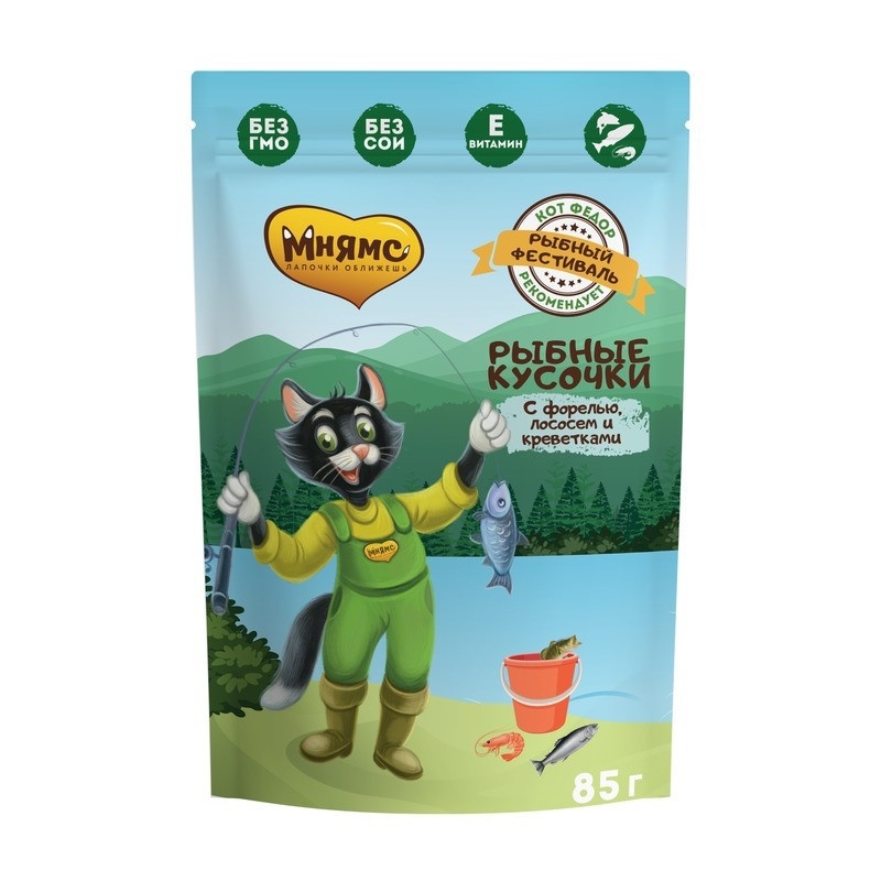 Мнямс Рыбный Фестиваль Рыбные кусочки влажный корм для кошек с лососем, креветками и форелью 85 г