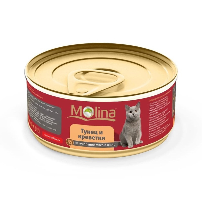Влажный корм Molina для взрослых кошек с тунцом и креветками в желе в консервах - 80 г
