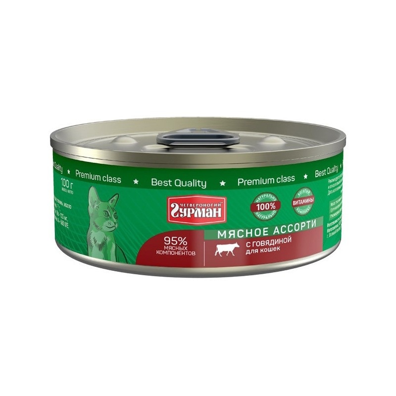 Консервы Четвероногий Гурман Мясное ассорти с говядиной для кошек на 100% состоят из натуральных компонентов и не содержат злаков, бобовых и овощей. Нет в них и синтетических витаминно-минеральных комплексов, ведь хорошее мясо уже содержит в себе необходимые животному микроэлементы. говядина (15%), сердце (14%), куриное мясо, легкое, печень, коллагенсодержащее сырье, животный белок, масло растительное, клетчатка, таурин, соль, вода питьевая. протеин – 12,3 г; жир – 7 г; клетчатка – 0,5 г; зола – 2 г, таурин — 0,2 г; влага — 82 г, соль 0,4 г. P — 137,7 мг; Ca – 9,06 мг, Na – 122,84 мг, Cl – 151,7 мг, Mg – 14,2 мг, Fe – 3,3 мг, Сu – 233,2 мкг, I — 2,9 мкг. A, E, B1, B2, B3, B5, B6. суточная норма 30 — 50 г на 1 кг веса животного. Рекомендуется употреблять при комнатной температуре.