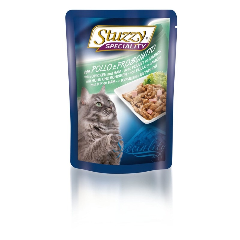 Полнорационные корма Stuzzy Speciality для кошек созданы итальянской компанией Agras Delic, которая имеет более 25 лет опыта в области разработки и производства кормов для животных. Новая линия полнорационных кормов Stuzzy Speciality для кошек - это 6 вкусов для кошек и 4 для собак без содержания красителей и консервантов. Нежные кусочки мяса - кролика, курицы, телятины рыбы - трески, для собак и такие же нежные кусочки мяса - кролика, телятины, курицы, говядины рыбы - трески и лосося для кошек специально приготовленные на пару для придания им наибольшей усвояемости и заманчивого вкуса. Все десять рецептов корма обогащены таурином и витамином Е для поддержания правильной работы сердца и имунной системы. А также инулином, способствующим всасыванию питательных веществ и биотином, делающим шерсть блестящей и шелковистой и поддерживающим здоровое состояние кожных покровов. Состав: Мясо и мясные субпродукты (45%, из них курица 10%, ветчина 5%), продукты растительного происхождения (инулин 0,4%), минералы. Анализ:
