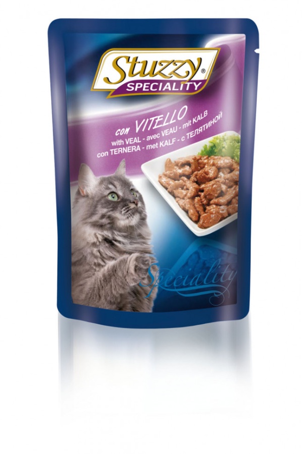 Полнорационные корма Stuzzy Speciality для кошек созданы итальянской компанией Agras Delic, которая имеет более 25 лет опыта в области разработки и производства кормов для животных. Новая линия полнорационных кормов Stuzzy Speciality для кошек - это 6 вкусов для кошек и 4 для собак без содержания красителей и консервантов. Нежные кусочки мяса - кролика, курицы, телятины рыбы - трески, для собак и такие же нежные кусочки мяса - кролика, телятины, курицы, говядины рыбы - трески и лосося для кошек специально приготовленные на пару для придания им наибольшей усвояемости и заманчивого вкуса. Все десять рецептов корма обогащены таурином и витамином Е для поддержания правильной работы сердца и имунной системы. А также инулином, способствующим всасыванию питательных веществ и биотином, делающим шерсть блестящей и шелковистой и поддерживающим здоровое состояние кожных покровов. Состав: Мясо и мясные субпродукты (45%, из них телятины 8%), добавки растительного происхождения (из которых инулина 0,4%), минералы. Анализ: