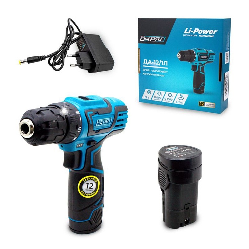 Дрель аккумуляторная ВАРЯГ ДА-12/1Л (12В, пат10мм, 2 скорости, 40Нм, АКБ Li-ion 2,0Ач) картон, 1 АКБ, З/У (1/10)