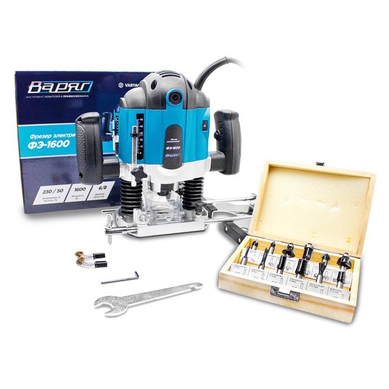 Фрезер электрический ВАРЯГ ФЭ-1600 (1600Вт,16000-30000об/мин,цанга(патрон)6/8мм), набор фрез (12 предметов)(1/4)