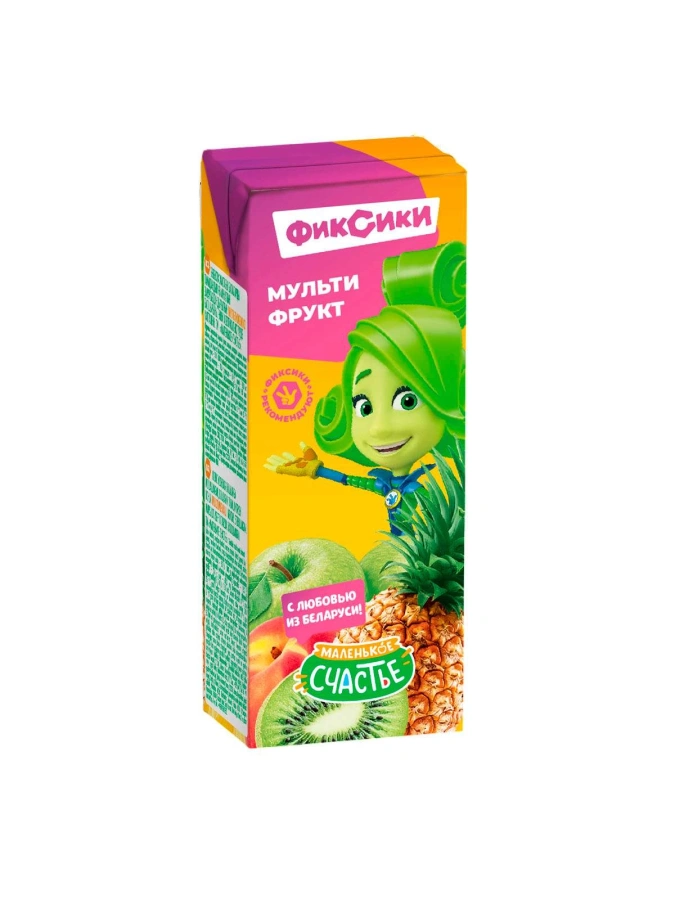 Сок мультифруктовый (сок яблочный, сок мандариновый, сок ананасовый, пюре из персиков, пюре из киви, сок маракуйи), сок яблочный осветлённый, сахар, вода питьевая.
