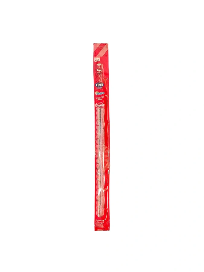 Это жевательный мармелад в форме трубочек от производителя Fini, покрытый кислой сахарной обсыпкой и имеющий насыщенный вкус и аромат клубники.