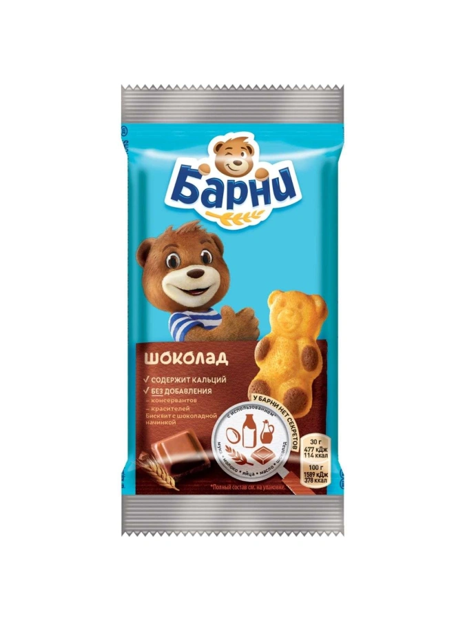 Пирожное бисквитное с шоколадной начинкой «Медвежонок Барни» 30г
