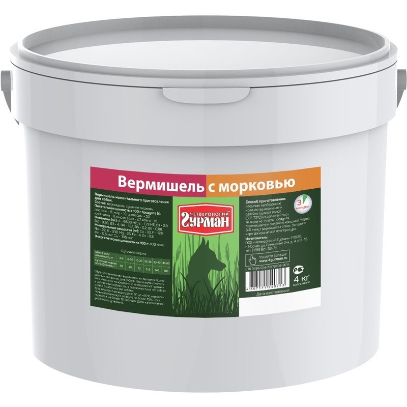 Рекомендуется использовать в сочетании с мясными консервами "Четвероногий гурман". Ингредиенты: вермишель, сушеная морковь. Пищевая ценность (в 100 г продукта): Минеральные вещества (в 100 г продукта): Витамины (в 100 г продукта): Энергетическая ценность (на 100 г): 400 ккал.