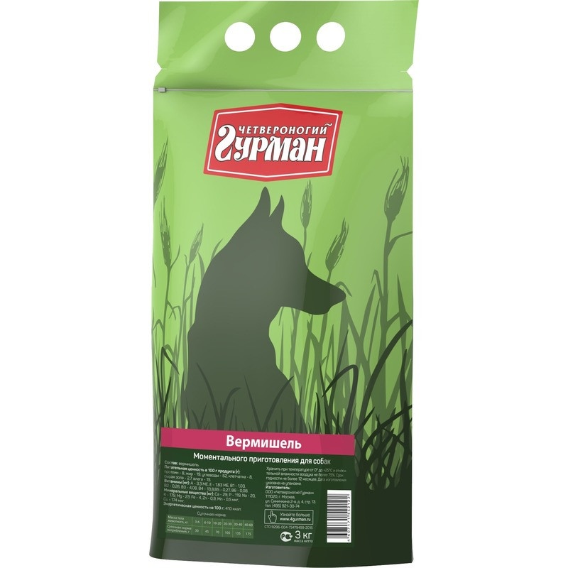 Рекомендуется использовать в сочетании с мясными консервами "Четвероногий гурман". Ингредиенты: вермишель. Пищевая ценность (в 100 г продукта): Минеральные вещества (в 100 г продукта): Витамины (в 100 г продукта): Энергетическая ценность (на 100 г): 410 ккал.