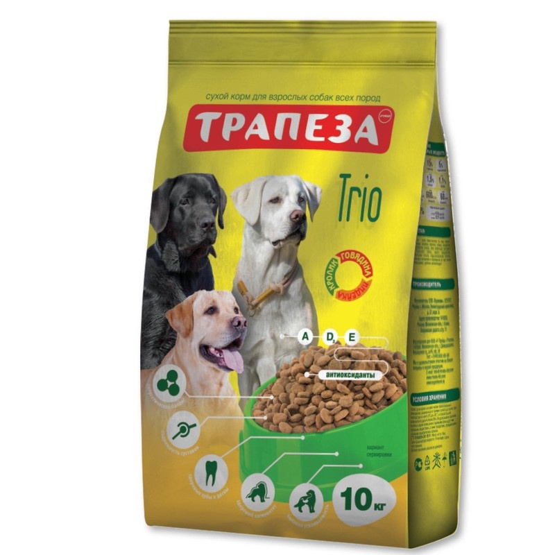 Сухой корм «Трапеза Трио» — полнорационный сбалансированный сухой корм, созданный специально для повседневного кормления собак всех пород, которые ведут активный образ жизни, имеют высокие энергетические потребности. Уникальное сочетание трех видов мяса: кролика, телятины, индейки, позволяет укрепить иммунитет собаки, способствует правильной работе кишечника и обеспечивает повышенную питательность продукта.