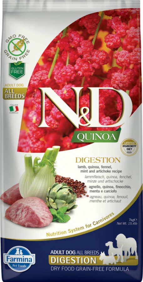 Полнорационный беззерновой сухой корм супер-премиум класса для взрослых собак с ягненком, киноа, фенхелем, мятой и артишоками для поддержки пищеварения. Состоит более чем на 50% из продуктов животного происхождения, не содержит злаков.
