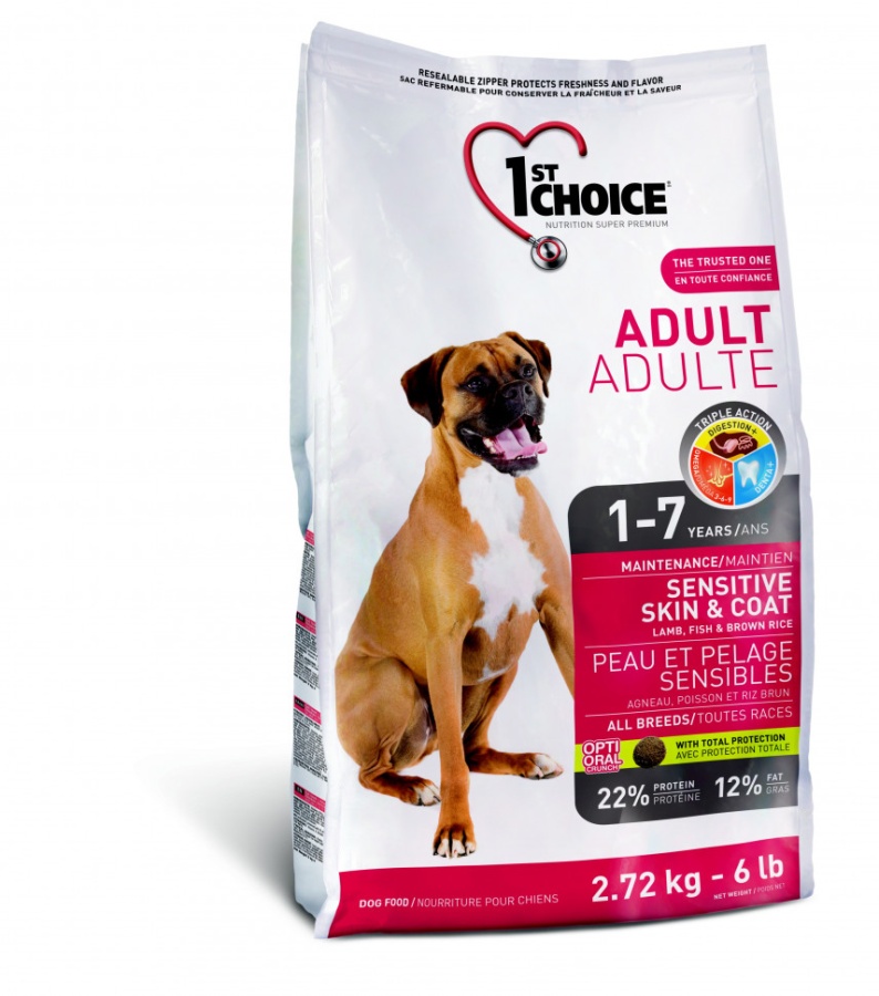 1st Choice Adult для взрослых собак с чувствительной кожей и для шерсти с ягненком, рыбой и рисом - 2.72 кг