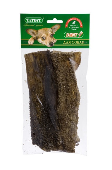 Высушенные пластины говяжьего рубца.Упаковка содержит 5-6 пластин длиной 19 см. Рубец говяжий представляет собой часть желудка КРС, точнее - первый из его преджелудков, в котором содержится полезная микрофлора. Ворсинки неочищенного сушёного рубца сохраняют на себе ферменты и витамины группы «В», вырабатываемые его микрофлорой при жизни животного. Содержат низкокалорийный, легкоусвояемый белок. Благодаря особой технологии сушки сохраняется до 60% процентов полезных веществ.