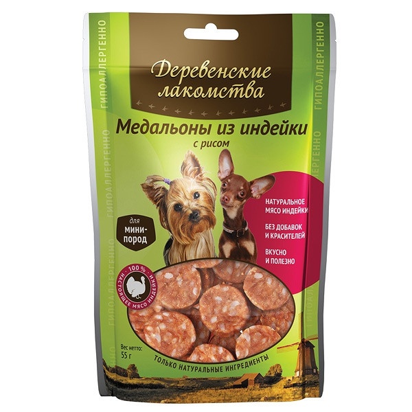 ДЕРЕВЕНСКИЕ ЛАКОМСТВА для мини-пород Медальоны из индейки с рисом 55 гр