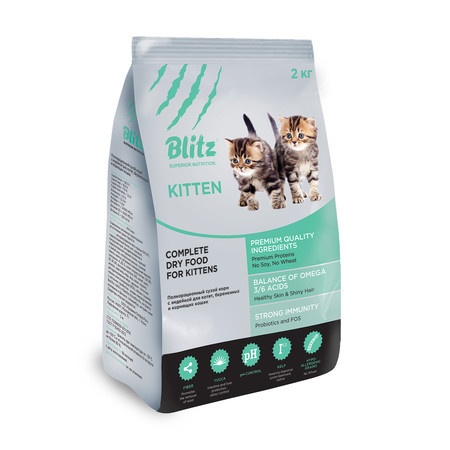 Сбалансированный сухой корм класса супер премиум обеспечивает особые потребности растущих котят, но также может быть использован для беременных и кормящих кошек: Blitz Kitten содержит оптимальный баланс белков, жиров и других питательных веществ. Живые пробиотики, добавленные в формулу корма "Блиц" для котят, способствуют правильному росту и развитию малышей, стимулируют формирование крепкого иммунитета. Входящий в состав корма фенхель снижает газообразование и успокаивает кишечник. Сухой корм Blitz с индейкой для котят, беременных и кормящих кошек учитывает особенности нежного и чувствительного пищеварительного тракта котёнка, а также необходимость в энергии для игр и познания мира.
