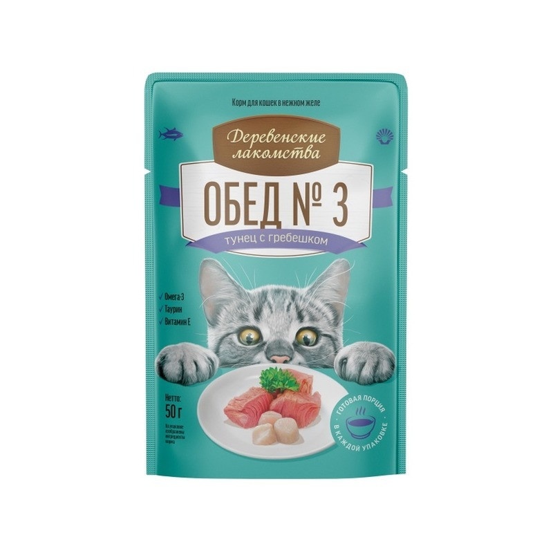 Деревенские лакомства влажный корм для кошек, обед №3 тунец с гребешком в нежном желе - 50 г