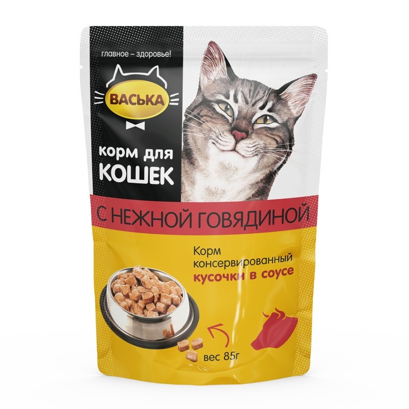 Васька влажный корм кусочки в соусе для кошек с говядиной в паучах - 85 г
